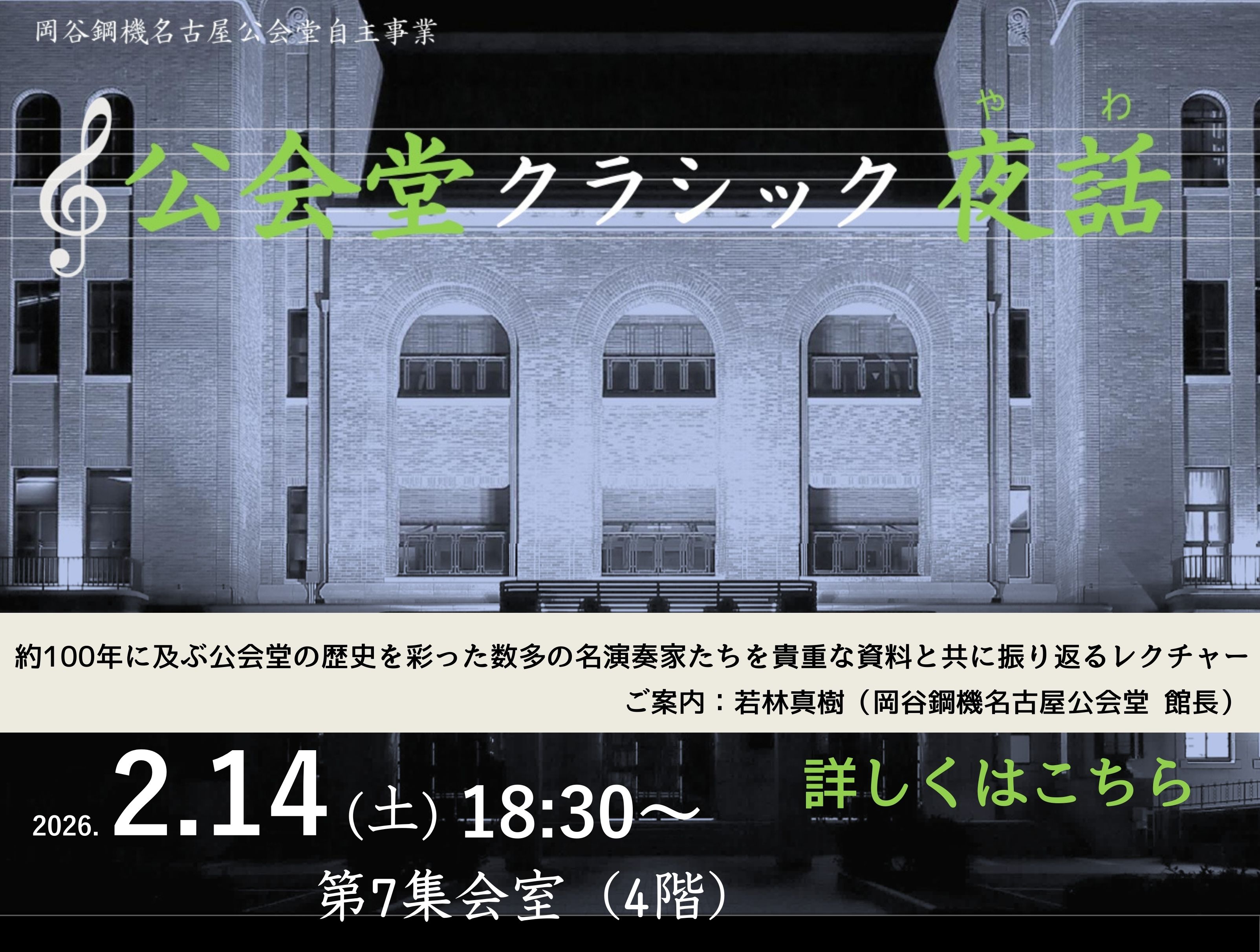 【名古屋市公会堂愛称決定のお知らせ】 名古屋市公会堂へのネーミングライツの導入により、愛称が下記のとおりとなります。 愛称:岡谷鋼機名古屋公会堂 パートナー企業:岡谷鋼機株式会社(名古屋市中区栄二丁目4番18号) 期間:令和6年(2024年)4月1日から5年間 |