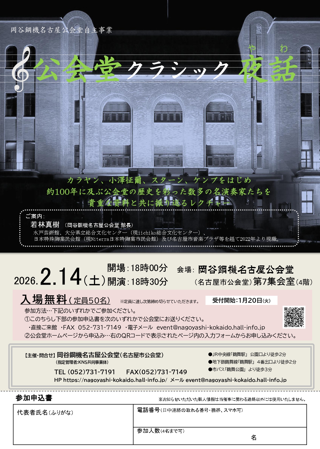 【名古屋市公会堂愛称決定のお知らせ】 名古屋市公会堂へのネーミングライツの導入により、愛称が下記のとおりとなります。 愛称:岡谷鋼機名古屋公会堂 パートナー企業:岡谷鋼機株式会社(名古屋市中区栄二丁目4番18号) 期間:令和6年(2024年)4月1日から5年間 |
